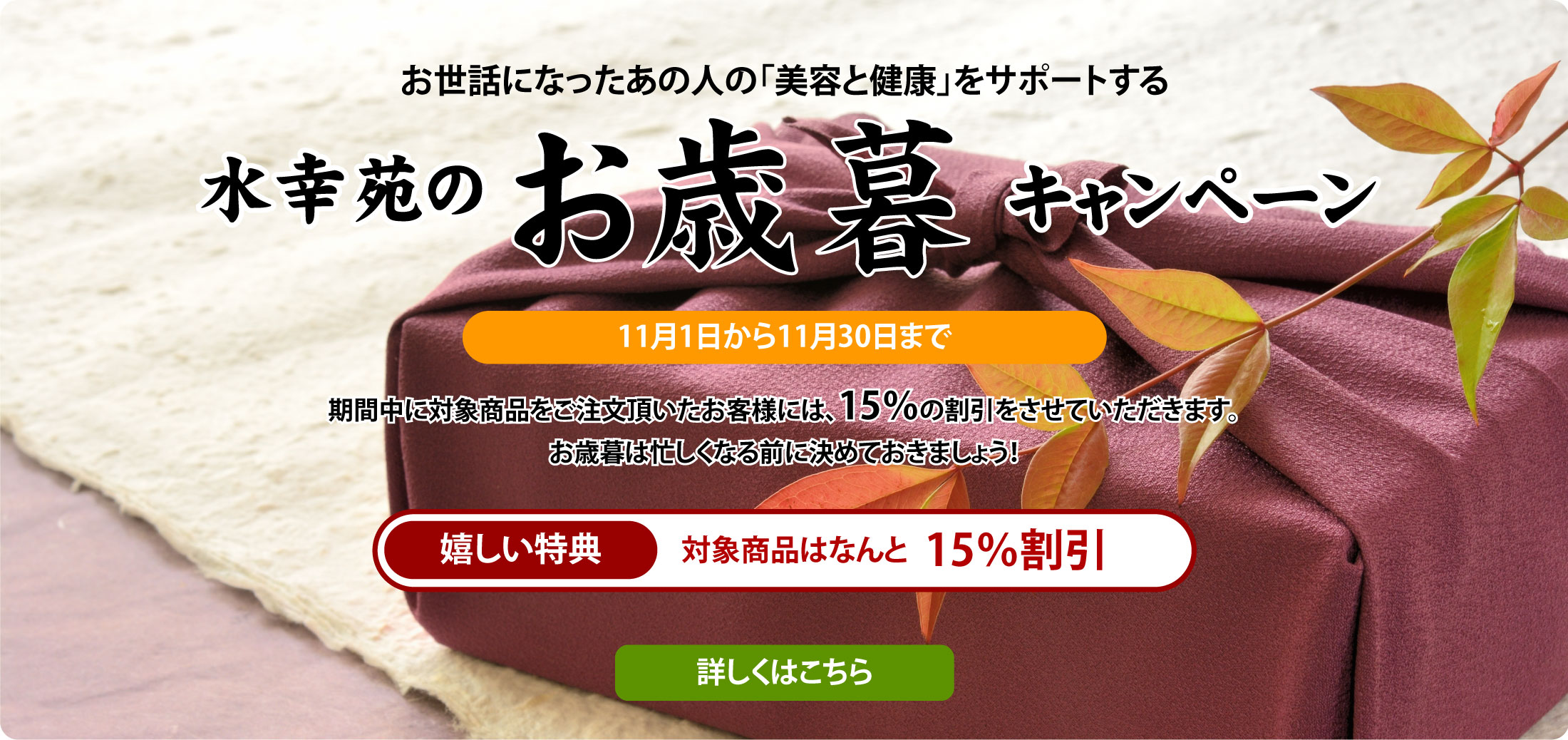 「お歳暮にすっぽん?」と思った方も多いのではないでしょうか?ですが、すっぽんには美容と健康に良いとされる成分が多く含まれています。お世話になった人の労をねぎらう意味でとてもよい贈り物だと思いませんか?水幸苑では、期間中に対象商品をご注文頂いたお客様に15%の割引価格でご提供させていただきます。お歳暮は忙しくなる前に決めておきましょう!