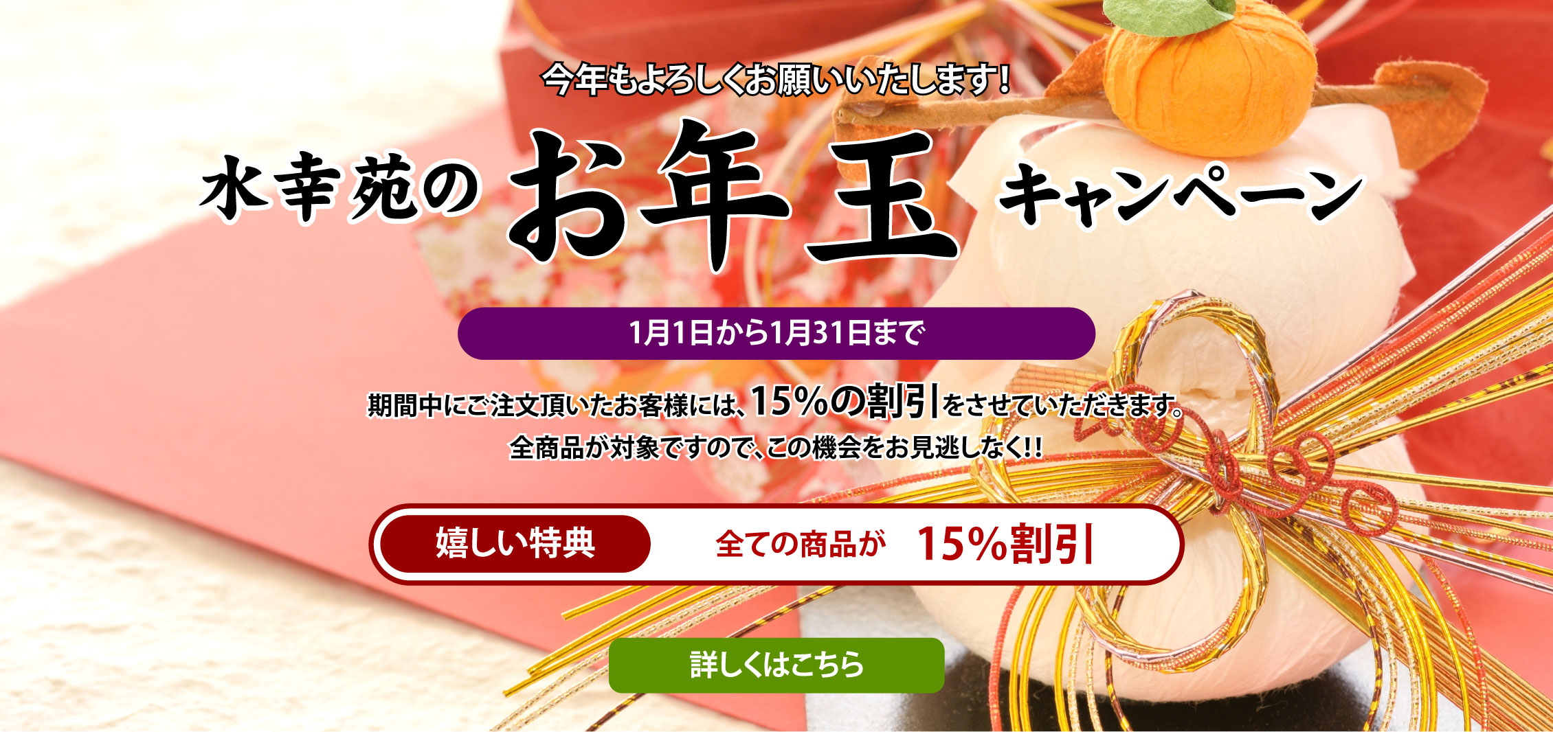 「お歳暮にすっぽん?」と思った方も多いのではないでしょうか?ですが、すっぽんには美容と健康に良いとされる成分が多く含まれています。お世話になった人の労をねぎらう意味でとてもよい贈り物だと思いませんか?水幸苑では、期間中に対象商品をご注文頂いたお客様に15%の割引価格でご提供させていただきます。お歳暮は忙しくなる前に決めておきましょう!